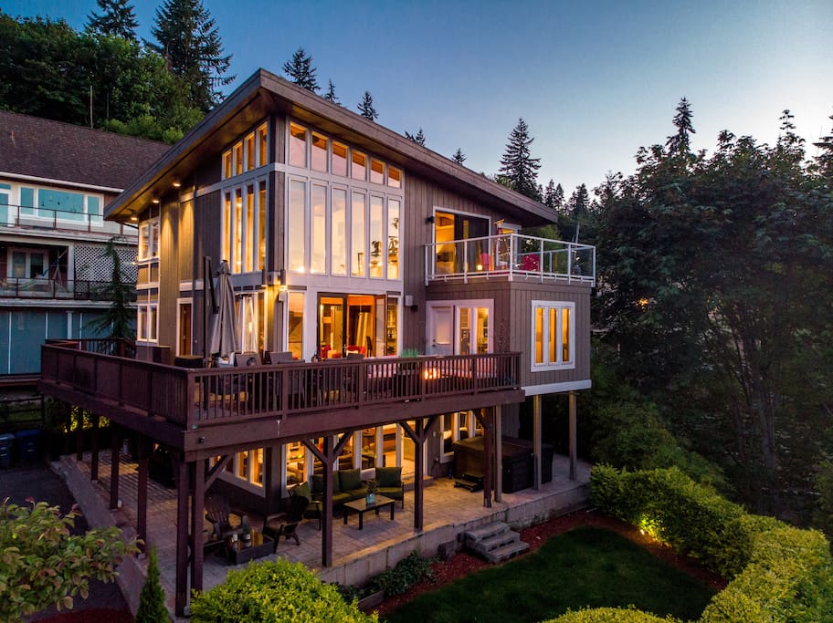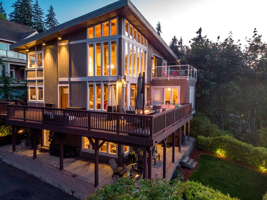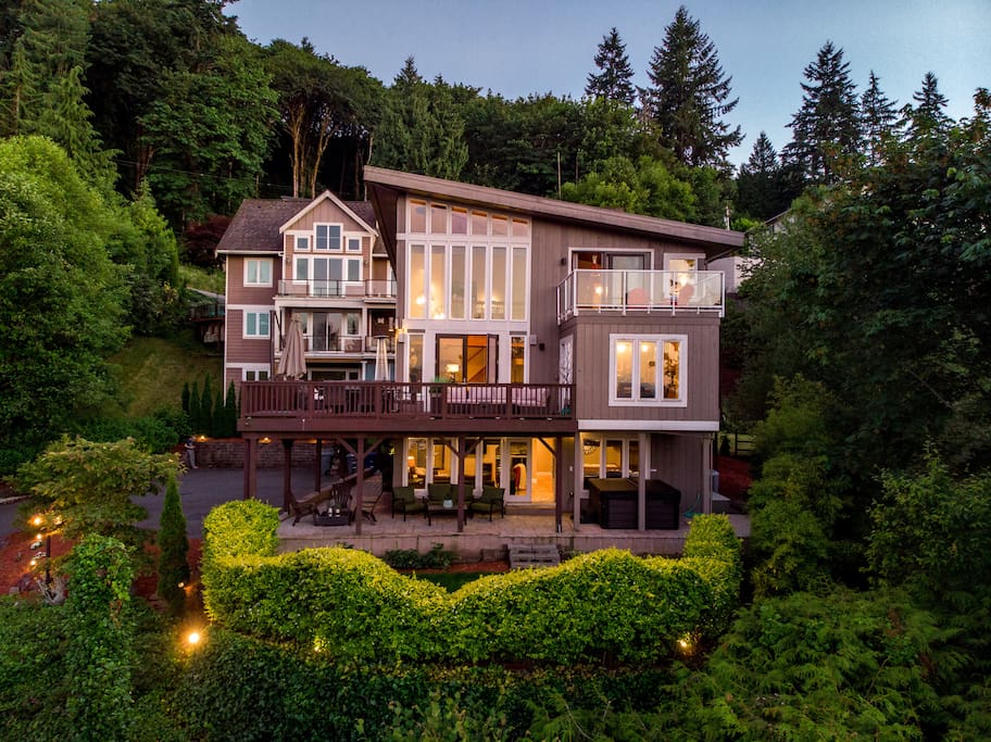A mountain cabin feel only minutes away from both Seattle and Bellevue! Exposed beams with three stories of wall to wall views of Lake Sammamish and surrounding mountains make our house something out of the ordinary. With a private hot tub and sauna, an air hockey/ping table, fully stocked gourmet kitchen, lots of baby gear and games for kids, an amazing master suite, great guest rooms, and lots of indoor and outdoor living space, the house is perfect for creating lasting memories together!