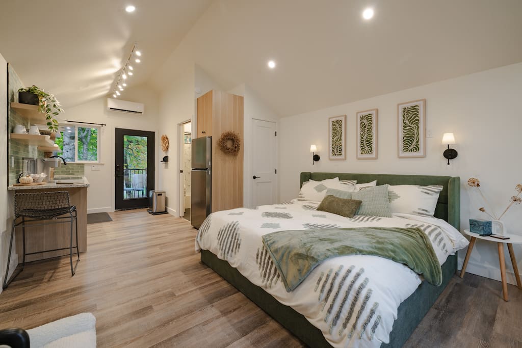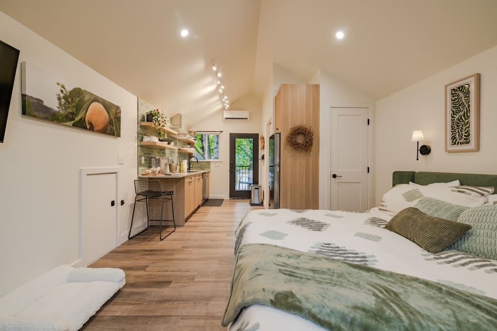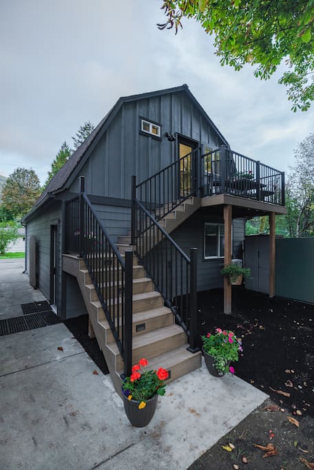 Welcome to The Gateway Barn — a newly renovated, modern 400 sq ft retreat perched above a detached garage, just steps from the main house where our family resides. With vaulted ceilings and thoughtfully designed amenities, this peaceful space is surrounded by trees and nature—an ideal place to reset after a day of adventure or work. The well-appointed kitchenette features high-end stainless steel appliances, fully stocked cupboards, and everything you need to prepare a meal—from pots and pans to utensils galore. Start your day with a complimentary pod in the Keurig, and settle into the cozy breakfast nook to sip your coffee, keep the cook company, or get a bit of work done. We've also included a curated selection of local wines available for purchase—cheers! Enjoy sit-down meals at the four-person dining table, and unwind in the evenings with your choice of Netflix, Hulu Live, Disney+, Paramount+, and Amazon Prime. The bathroom is stocked with plush oversized towels, a hair dryer, and essential toiletries for your comfort. At night, sink into a luxurious King-size Casper mattress with ultra-soft bedding for a truly restful sleep. Step outside to grill on the private deck’s BBQ or enjoy a quiet moment at the bistro table just downstairs. You’re just minutes away from hiking, walking, and mountain bike trailheads—less than 5 minutes on foot or 2 by bike. Downtown Issaquah’s restaurants and shops are a quick 3-minute drive or a 15-minute walk via the Rainier Trail. Prefer skiing? Snoqualmie Pass is just 40 minutes away, and downtown Seattle is under 25. If The Gateway Barn is unavailable and you're a small group, please message Kelsey to inquire about staying at The Gateway House (our main residence) or The Gateway Getaway—both just a few doors away and equally welcoming.