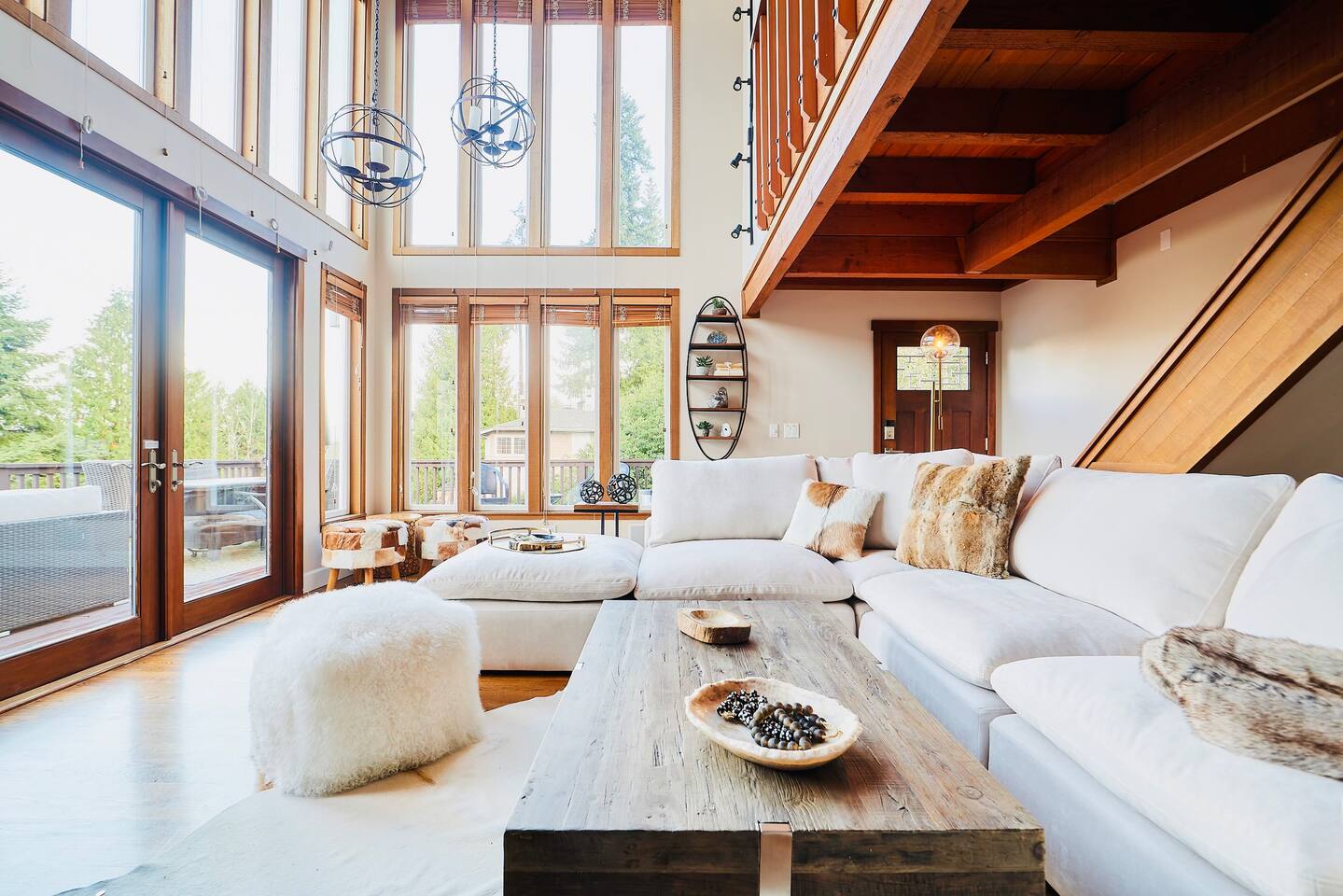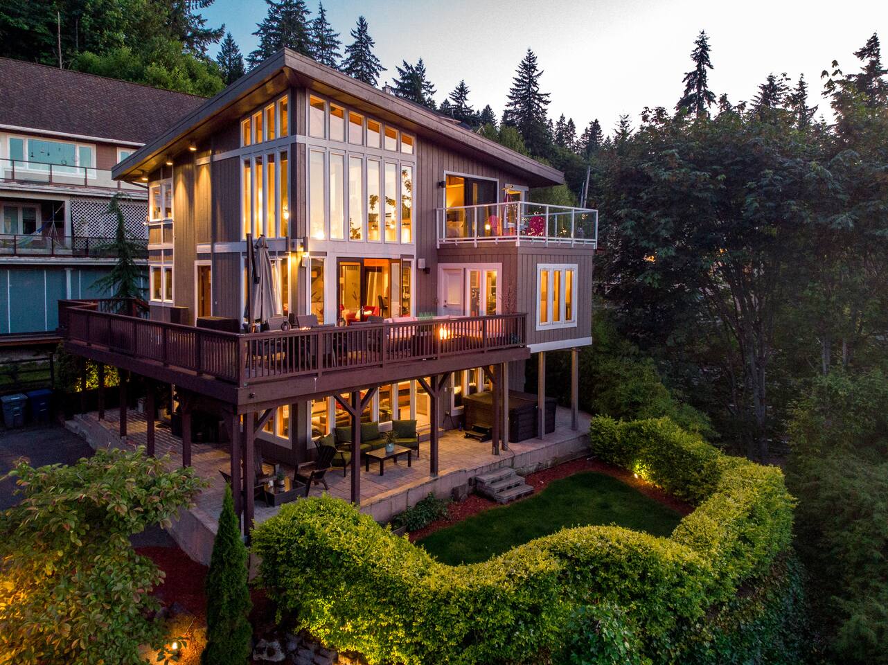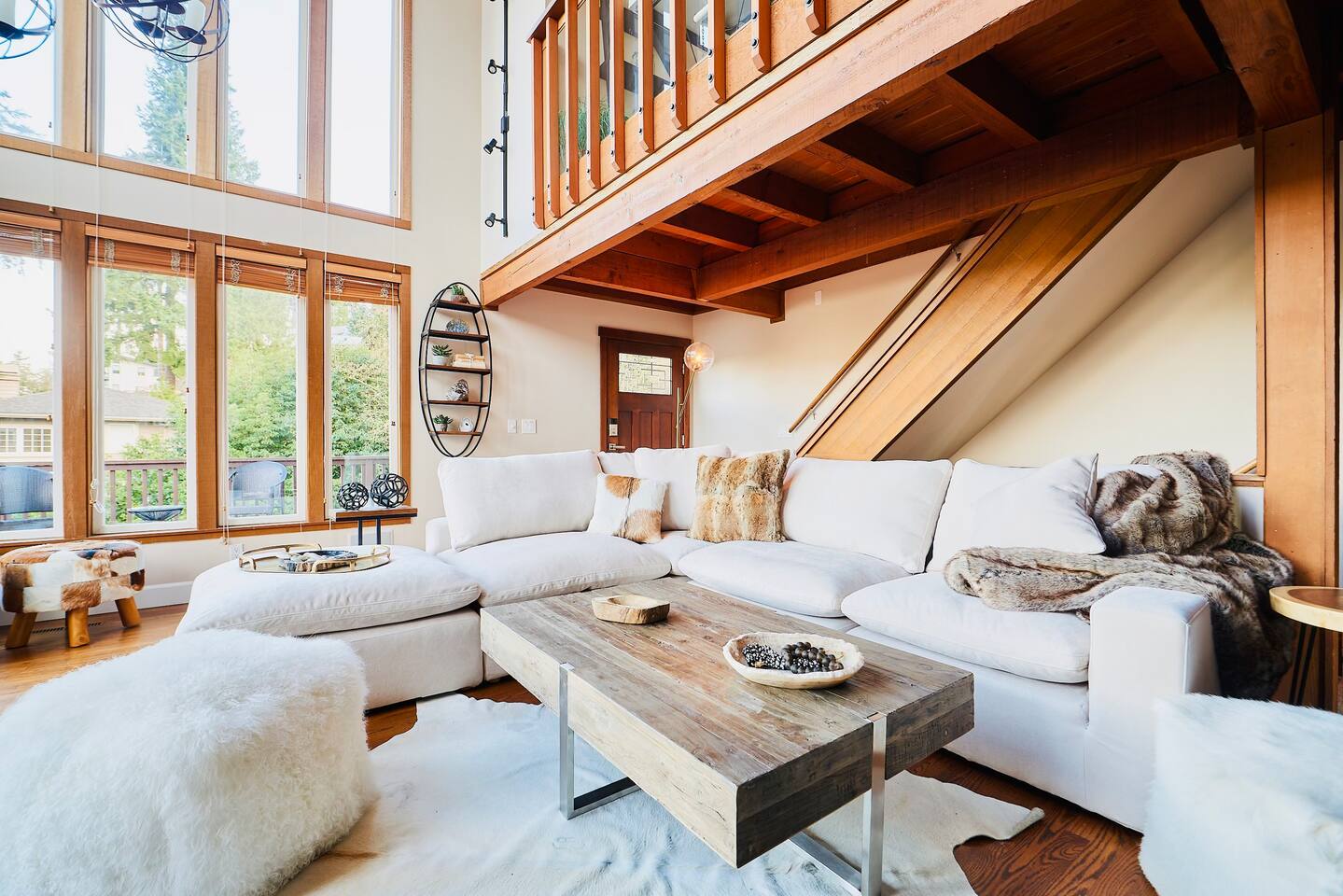 A mountain cabin feel only minutes away from both Seattle and Bellevue! Exposed beams with three stories of wall to wall views of Lake Sammamish and surrounding mountains make our house something out of the ordinary. With a private hot tub and sauna, an air hockey/ping table, fully stocked gourmet kitchen, lots of baby gear and games for kids, an amazing master suite, great guest rooms, and lots of indoor and outdoor living space, the house is perfect for creating lasting memories together!