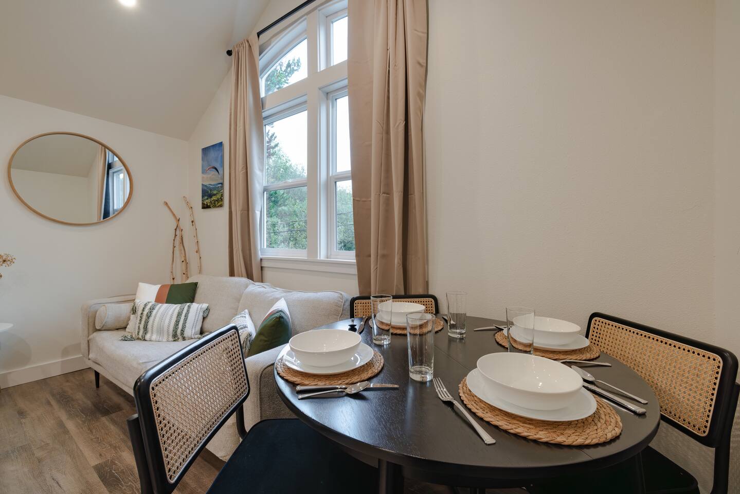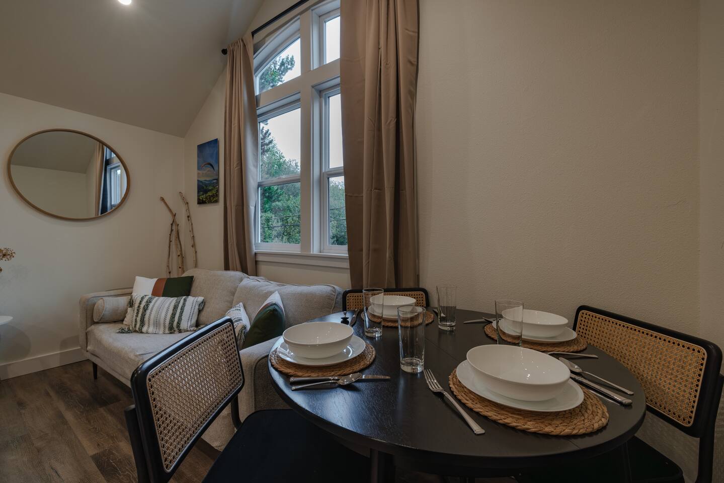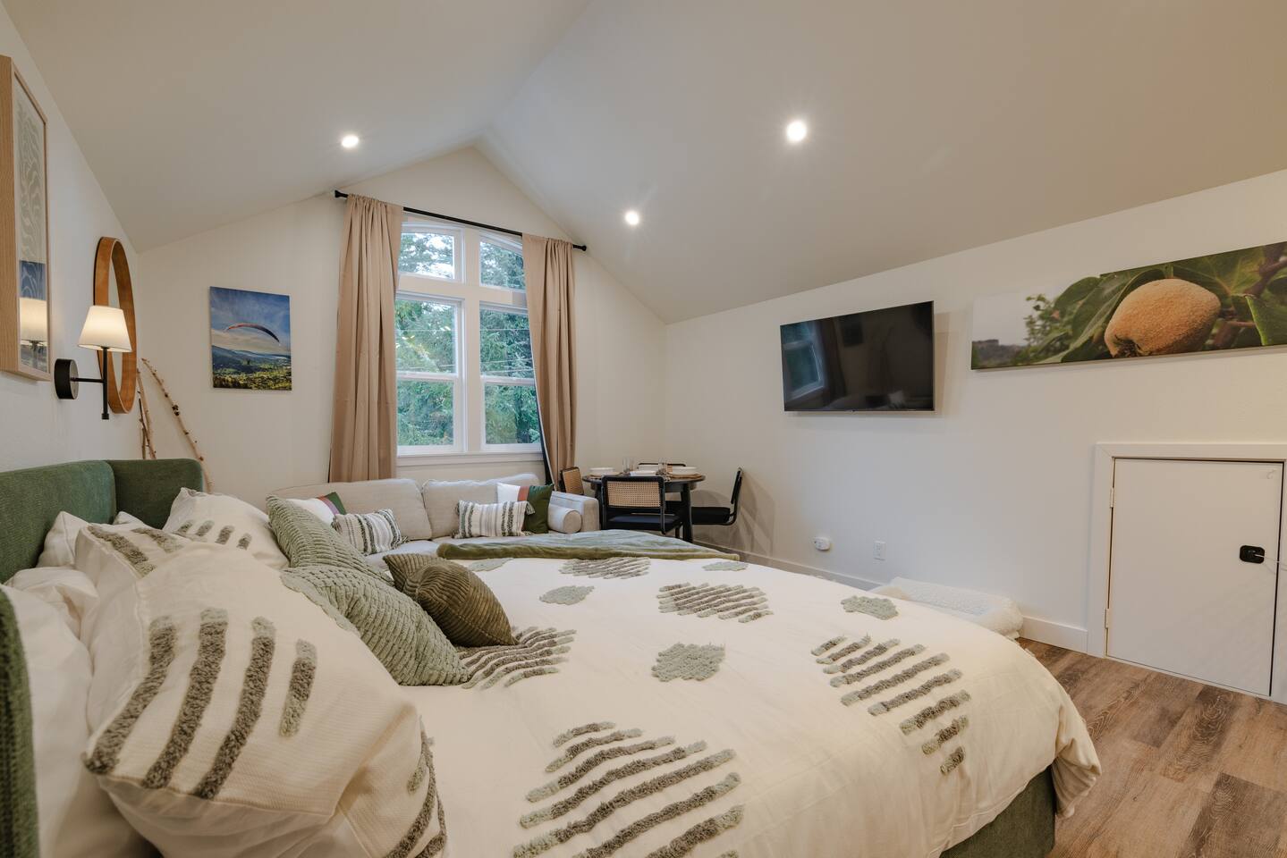 Welcome to The Gateway Barn — a newly renovated, modern 400 sq ft retreat perched above a detached garage, just steps from the main house where our family resides. With vaulted ceilings and thoughtfully designed amenities, this peaceful space is surrounded by trees and nature—an ideal place to reset after a day of adventure or work. The well-appointed kitchenette features high-end stainless steel appliances, fully stocked cupboards, and everything you need to prepare a meal—from pots and pans to utensils galore. Start your day with a complimentary pod in the Keurig, and settle into the cozy breakfast nook to sip your coffee, keep the cook company, or get a bit of work done. We've also included a curated selection of local wines available for purchase—cheers! Enjoy sit-down meals at the four-person dining table, and unwind in the evenings with your choice of Netflix, Hulu Live, Disney+, Paramount+, and Amazon Prime. The bathroom is stocked with plush oversized towels, a hair dryer, and essential toiletries for your comfort. At night, sink into a luxurious King-size Casper mattress with ultra-soft bedding for a truly restful sleep. Step outside to grill on the private deck’s BBQ or enjoy a quiet moment at the bistro table just downstairs. You’re just minutes away from hiking, walking, and mountain bike trailheads—less than 5 minutes on foot or 2 by bike. Downtown Issaquah’s restaurants and shops are a quick 3-minute drive or a 15-minute walk via the Rainier Trail. Prefer skiing? Snoqualmie Pass is just 40 minutes away, and downtown Seattle is under 25. If The Gateway Barn is unavailable and you're a small group, please message Kelsey to inquire about staying at The Gateway House (our main residence) or The Gateway Getaway—both just a few doors away and equally welcoming.
